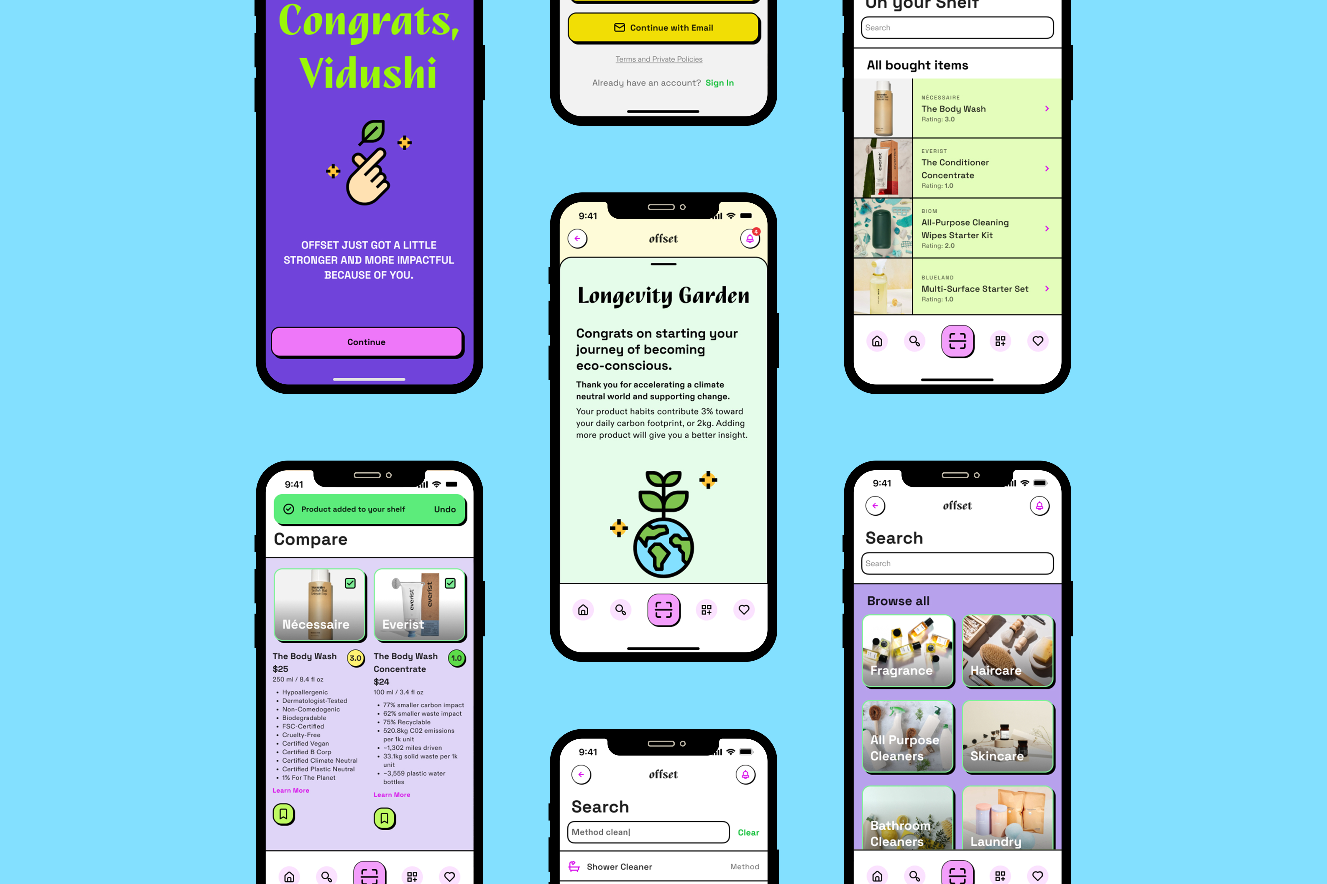 Assisting users in becoming well-informed shoppers, whether they're in physical stores or shopping online. With a user-friendly interface, the app empowers eco-conscious individuals to search or scan barcodes, access product emission information, and make informed buying decisions based on sustainability ratings. When a user makes an environmentally responsible purchase, they earn offset points, a personal impact score, savings, and receive information on their carbon emissions, offering insights into their individual climate impact.
